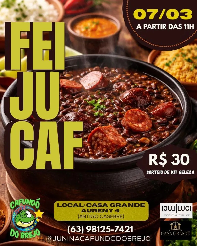 A Junina Cafundó do Brejo realiza no dia 7 de março, a partir das 11h, no Casa Grande (antigo Casebre), no Aureny IV, a “FeijuCaf”, evento organizado para arrecadar recursos destinados à preparação da temporada junina de 2026.